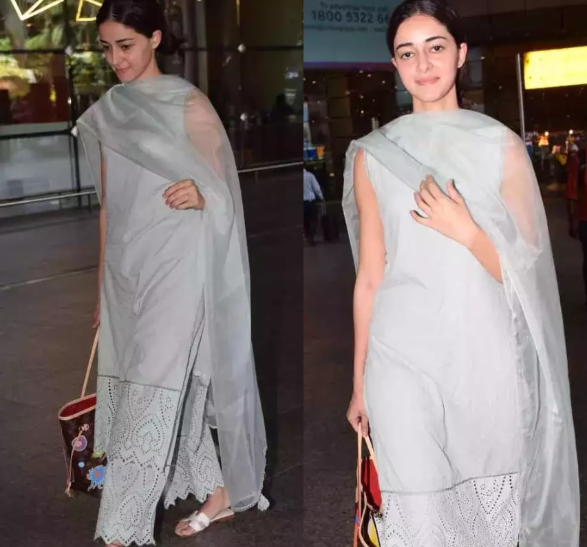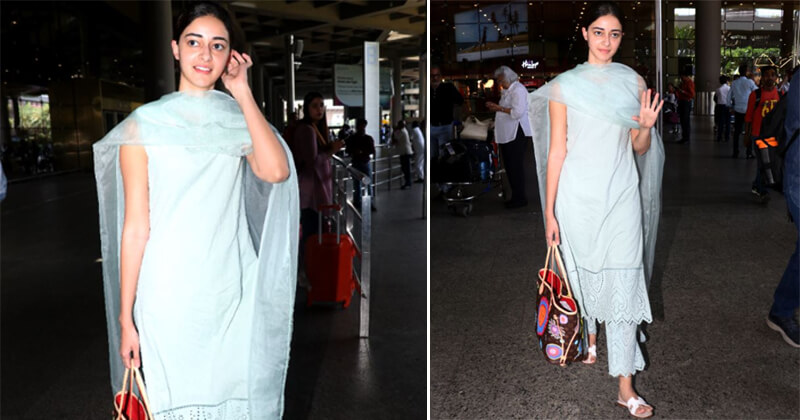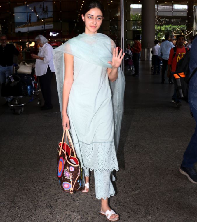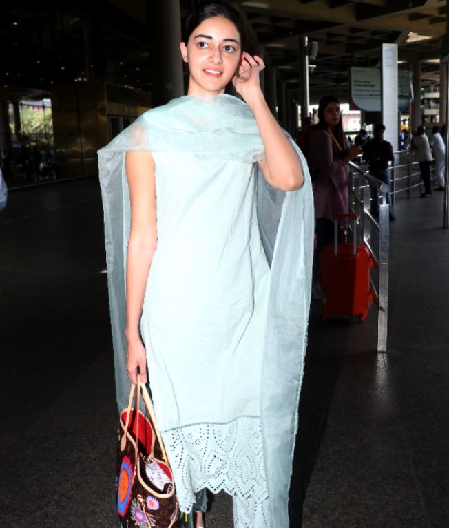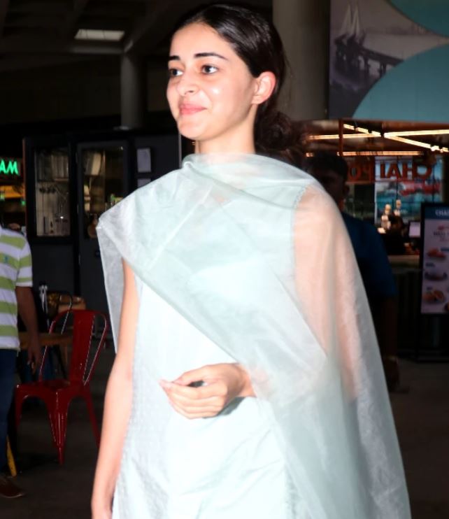 જ્યાંથી તેની તસવીરો સોશિયલ મીડિયા પર ખૂબ વાયરલ થઈ હતી. આ તસવીરોમાં અનન્યા પાંડે સલવાર સૂટમાં ખૂબ જ સિંપલ લુકમાં જોવા મળી હતી અને આ દરમિયાન તેણ ઘણી સુંદર લાગી રહી છે. આ તસવીરોમાં અનન્યા પાંડેએ સિંપલ સ્લીવલેસ સૂટ સાથે પલાઝો કેરી કર્યો હતો અને આ સાથે તેણે દુપટ્ટો પણ કેરી કર્યો હતો.