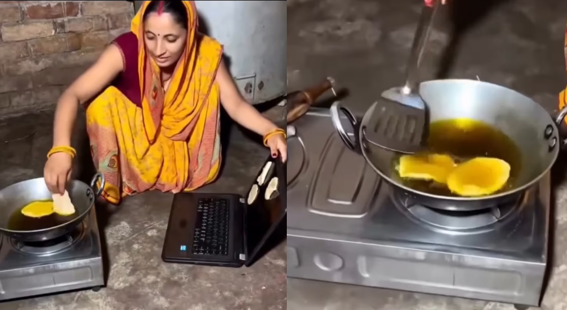 એક મહિલા રસોઈ બનાવવા બેઠી છે. સામાન્ય રીતે જ્યારે કોઈ મહિલા રોટલી કે પછી પુરી વણે છે તો તે માટે વેલણનો ઉપયોગ કરે છે, પરંતુ આ આન્ટીજી તેના માટે લેપટોપનો ઉપયોગ કર્યો છે.. વીડિયોમાં દેખાય છે કે તે લોટના ગોળા બનાવીને લેપટોપ પર મૂકે છે અને પછી તેને બંધ કરીને પુરી વણે છે.