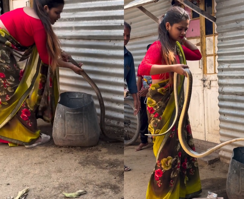 આજકાલ સોશિયલ મીડિયા પર અનોખા કન્ટેન્ટ વાયરલ થતા રહે છે. સામાન્ય રીતે છોકરીઓના ડાન્સ કે ગ્લેમરસ લૂક ચર્ચામાં રહે છે, પરંતુ ક્યારેક એવું પણ થાય છે કે એક વીડિયો બધાને આશ્ચર્યચકિત કરી દે. તાજેતરમાં જ એવો જ એક વીડિયો સામે આવ્યો છે, જેમાં એક યુવતી પરંપરાગત સાડીમાં સજીને દેખાય છે, પરંતુ તે ડાન્સ માટે નહીં, પરંતુ જોખમી સાપ પકડવા માટે પહોંચી છે.