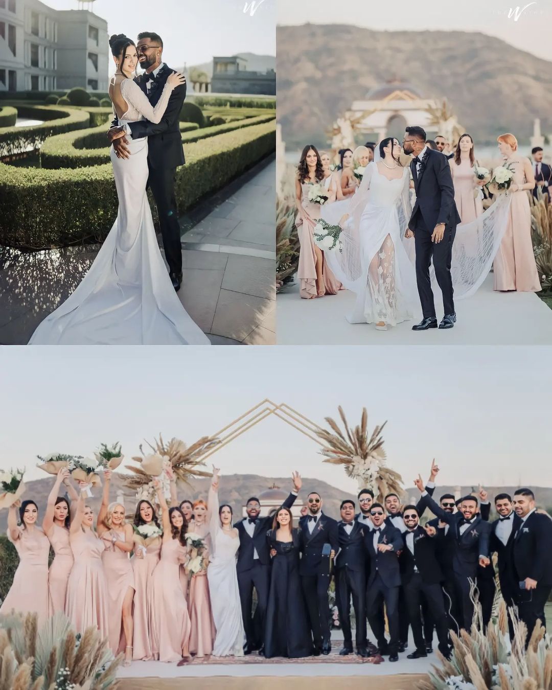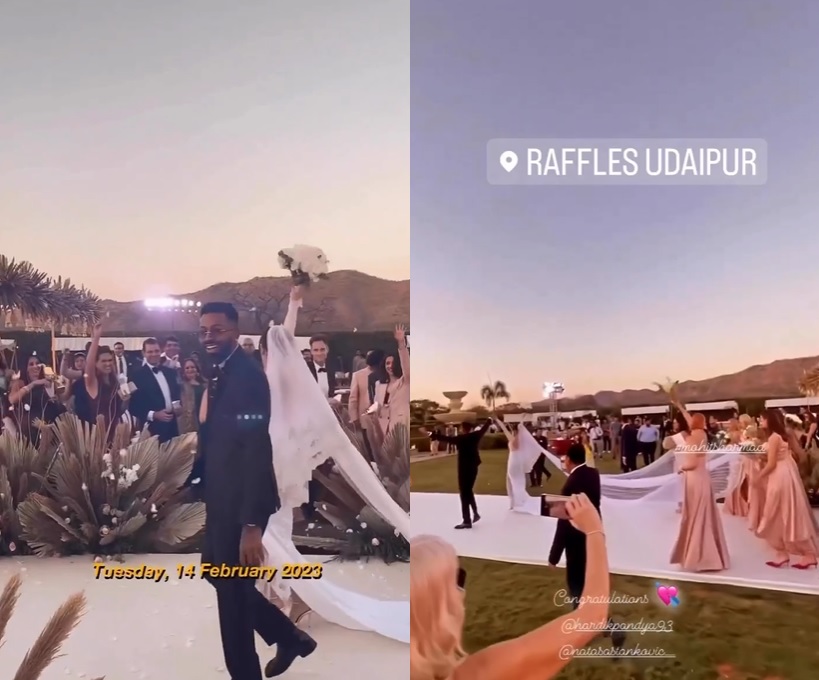 ત્યારે હવે સ્ટાર ઓલરાઉન્ડર હાર્દિક પંડ્યા એક્ટ્રેસ અને મોડલ નતાશા સ્ટેનકોવિક સાથે ફરીથી લગ્નના બંધનમાં બંધાયો છે. રાજસ્થાનના ઉદયપુરમાં આ કપલે ક્રિશ્ચિયન રીતિ-રિવાજથી લગ્ન કર્યા હતા. આ કપલે લગ્ન દરમિયાન શાહી એન્ટ્રી લીધી હતી. જેનો વીડિયો સોશિયલ મીડિયા પર સામે આવ્યો છે અને હવે વાયરલ થઈ રહ્યો છે. હાર્દિક પંડ્યા અને નતાશાએ સ્ટેજ પર જતાં રોયલ એન્ટ્રી લીધી હતી. આ દરમિયાન હાર્દિક પંડ્યા બ્લેક સૂટ, સફેદ શર્ટ, બો ટાઈ અને ટીન્ટેડ ચશ્મામાં જોવા મળ્યો, તો નતાશા રોયલ વ્હાઇટ વેડિંગ ગાઉનમાં જોવા મળી.