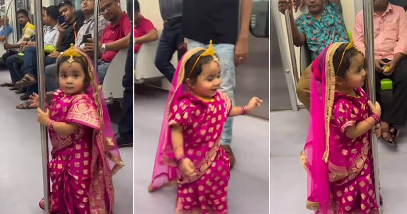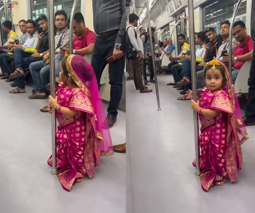 આ વીડિયો સોશિયલ મીડિયા પર ઝડપથી વાયરલ થઈ રહ્યો છે, જેને ખૂબ જ જોવામાં અને પસંદ કરવામાં આવી રહ્યો છે. kolkata_oikkotaan નામના એકાઉન્ટ દ્વારા ઈન્સ્ટાગ્રામ પર શેર કરવામાં આવેલા આ વીડિયોમાં એક છોકરી ખૂબ જ સુંદર ગુલાબી રંગની સિલ્ક સાડી પહેરેલી જોવા મળે છે. છોકરીના કપાળ પર બિંદી અને મુગટ છે. વાળમાં બન્સ અને ફૂલો છે. આ દરમિયાન બધાનું ધ્યાન મેટ્રોમાં રહેલી બાળકી પર હતું.