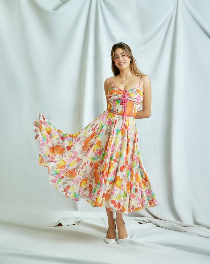 જાહ્નવીએ સ્પેગેટી સ્ટ્રેપ વાળો ડ્રેસ પસંદ કર્યો છે. જે ખૂબ જ પાતળા હોય છે. આવી સ્થિતિમાં તેના શોલ્ડર અને કોલર બોન હાઈલાઈટ થતા દેખાઈ રહ્યા છે. સાથે જ ડ્રેસની સ્વીટહાર્ટ નેકલાઈન હોવાના કારણે એક્ટ્રેસના કર્વ પણ સુંદર રીતે ફ્લોન્ટ થયા.જાહ્નવીના ડ્રેસના જે પણ ભાગ પર તમારી નજર જશે, ત્યાં ફ્લોરલ પ્રિન્ટ જોવા મળશે. ટોપ પોર્શન બોડી ફિટેડ છે.