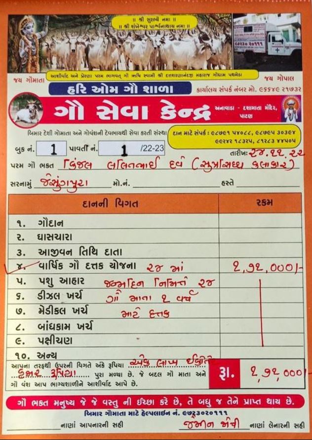 આ ઉપરાંત પણ કિંજલ દવેએ એક અનોખું કામ કર્યું છે જેના કારણે તેની વાહ વાહ પણ થઇ રહી છે. કિંજલે હરિઓમ ગૌ શાળા અનાવાડા પાટણમાં 24માં જન્મ દિવસે 24 ગાયોને 1 વર્ષ માટે દત્તક લીધી છે અને તેના નિભાવ ખર્ચ માટે કિંજલ દવેએ 1,71,000/- રૂપિયાનું પણ દાન આપ્યું છે.કિંજલના આ કાર્યના લોકો ખુબ જ વખાણ પણ કરી રહ્યા છે.