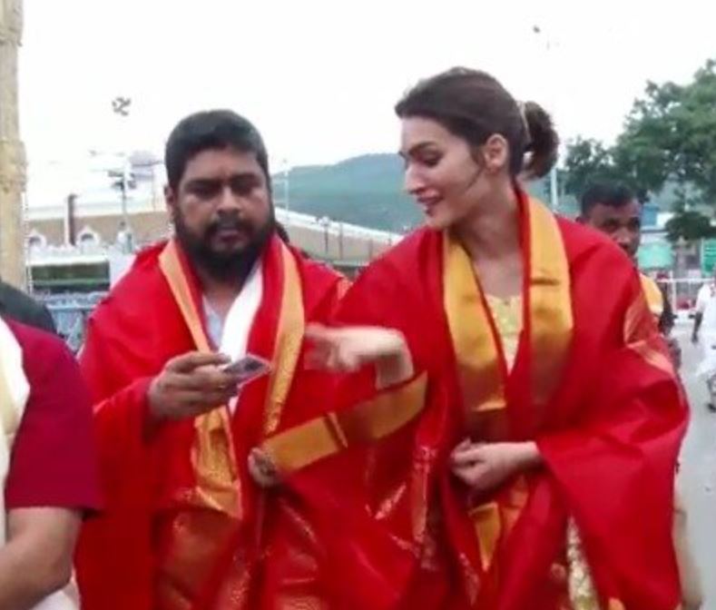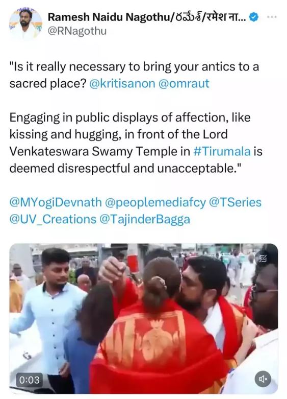 Pecks & flying kiss are not allowed & it’s basic sense they shouldn’t do this in temple premises. #Bollywood actor #KritiSanon greeted Director #OmRaut with a peck & in return #OmRaut with a flying kiss while leaving after #LordVenkateshwara darshan in #Tirupati. pic.twitter.com/qiGEs6gwyD