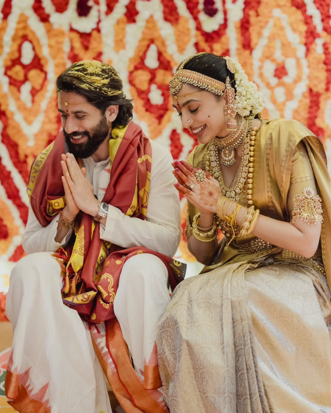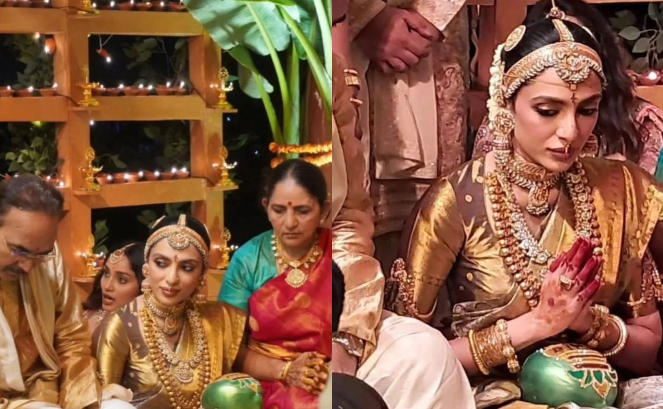અભિનેત્રીએ ગોલ્ડન કાંજીવરમ સાડી પહેરી હતી અને આ સિવાય તે માથાથી પગ સુધી સોનાના દાગીનાથી લદાયેલી હતી. શોભિતાએ ટ્રેડિશનલ ટેમ્પલ જ્વેલરી પહેરી હતી, જે સામાન્ય રીતે તેલુગુ દુલ્હન પહેરે છે.
