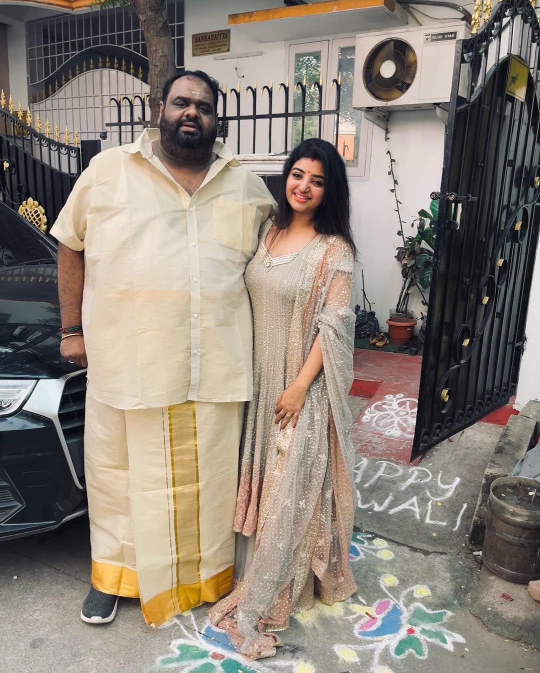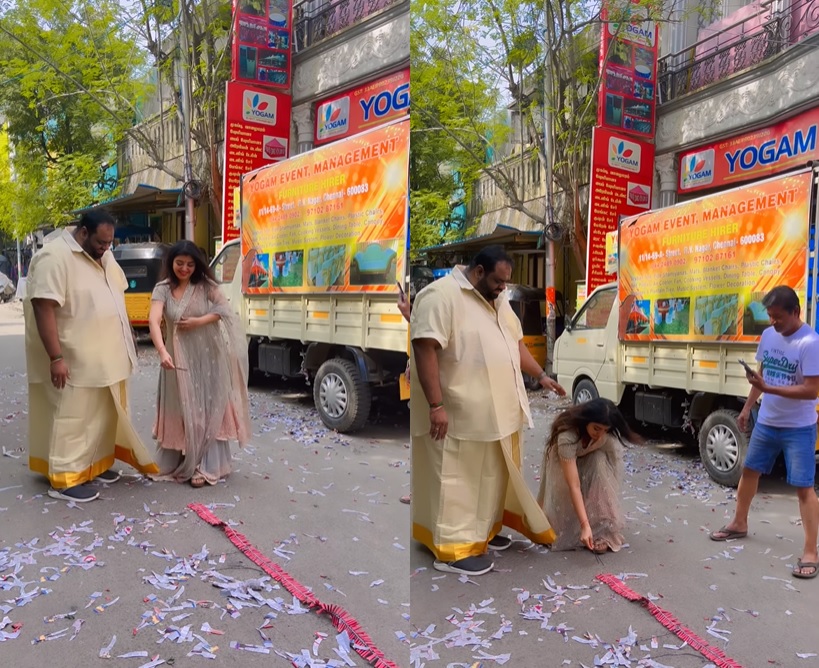 જાણિતા ફિલ્મમેકર રવિન્દ્ર ચંદ્રશેખરન અને સાઉથની મશહૂર-ખૂબસુરત અભિનેત્રી મહાલક્ષ્મી થોડા સમય પહેલા જ લગ્નના બંધનમાં બંધાયા હતા. તેઓએ પરિવાર અને નજીકના મિત્રોની હાજરીમાં ફેરા ફર્યા હતા. ત્યારે લગ્ન બાદ અભિનેત્રી તેના પતિ સાથે પહેલી દીવાળી સેલિબ્રેટ કરી હતી. તેણે એક વીડિયો પણ ઇન્સ્ટાગ્રામ પર શેર કર્યો છે. જેમાં તે તેના પતિ રવિન્દ્ર ચંદ્રશેખરન સાથે ફટાકડા ફોડતી જોવા મળી રહી છે.