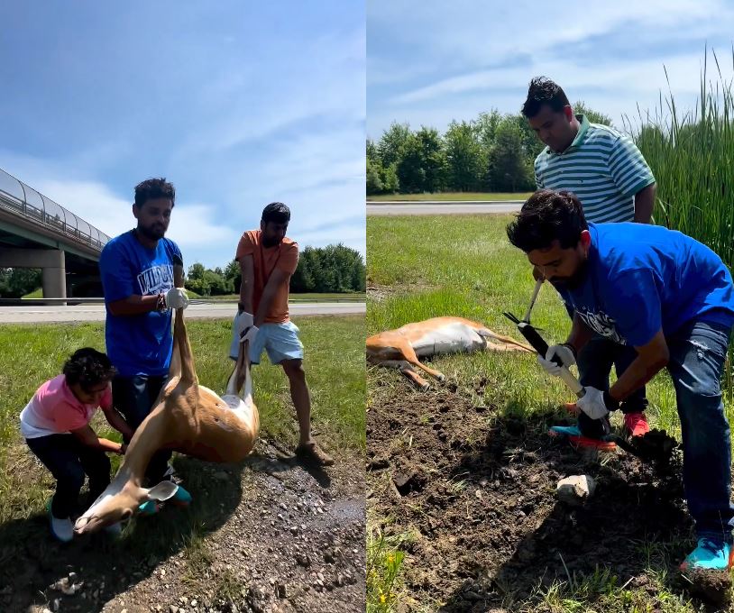 સામે આવેલા વીડિયોમાં જોઈ શકાય છે કે નીતિન જાની અને તેમની ટીમના સભ્યો રોડ પર પડેલા એક મૃત હરણને રોડની બાજુમાં લઇ જાય છે. જેના બાદ તેને ખાડો કરીને દફનાવવાની તેમની ઈચ્છા હતી, પરંતુ તેમની પાસે કોઈ ઓજાર નહોતા, જેના કારણે તે હાઇવેની બાજુમાં આવેલા એક સ્ટોરમાં જાય છે અને ત્યાંથી તે પાવડો અને જમીન ખોદી શકાય એવો સમાન લઈને આવે છે.