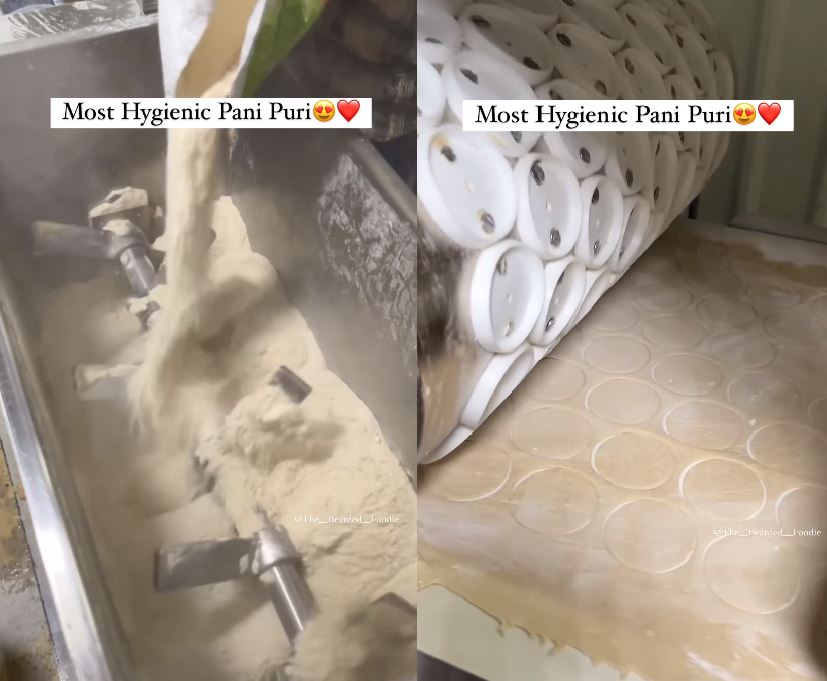 ફૂડ વ્લોગરે શેર કરેલ આ વિડિયો ગુજરાતના સુરતની એક ફેક્ટરીમાં રેકોર્ડ કરવામાં આવ્યો હતો. વીડિયોની શરૂઆત એક મોટા મશીનમાં લોટ પડવાથી થાય છે. કોઈએ લોટની આખી કોથળી અને એટલું જ પાણી એક મોટા પાત્રમાં નાખ્યું, લોટ બાંધ્યો અને પછી તેને સપાટ શીટમાં ફોલ્ડ કર્યો. તમને જણાવી દઈએ કે આ બધુ કામ કોઈ માણસે નથી કર્યું પરંતુ આ સમગ્ર પ્રક્રિયા મશીન દ્વારા કરવામાં આવી હતી. આ પછી, આ લોટને એક મોટી ચપટી ચાદર પર પાથરીને પછી ગોળ પાણીપુરી તૈયાર કરવામાં આવે છે.