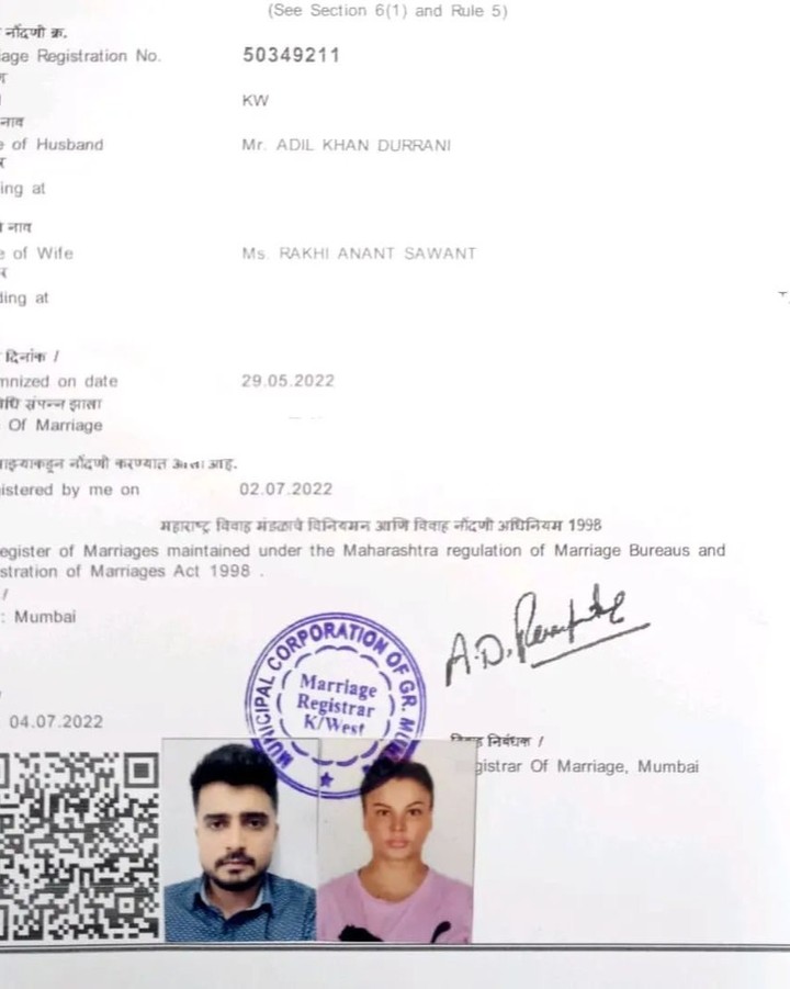 બોલિવૂડની ડ્રામા ક્વીન રાખી સાવંતને લઈને એક મોટા સમાચાર સામે આવ્યા છે. રાખીએ તેના બોયફ્રેન્ડ આદિલ ખાન દુર્રાની સાથે બીજા લગ્ન કરી લીધા છે. પહેલા પતિ સાથે છૂટાછેડા લીધા બાદ રાખીએ આદિલ સાથે કોર્ટ મેરેજ કર્યા છે. બંનેના લગ્નની તસવીરો સોશિયલ મીડિયા પર વાયરલ થઈ રહી છે. આદિલને ડેટ કર્યા બાદ રાખી સાવંતે તેને પોતાનો લાઈફ પાર્ટનર બનાવ્યો છે. લગ્નની વાયરલ તસવીરોમાં રાખી અને આદિલ મેરેજ સર્ટિફિકેટ પર સહી કરતા જોવા મળે છે. બીજી એક તસવીરમાં રાખી અને આદિલના હાથમાં મેરેજ સર્ટિફિકેટ જોવા મળી રહ્યુ છે.
