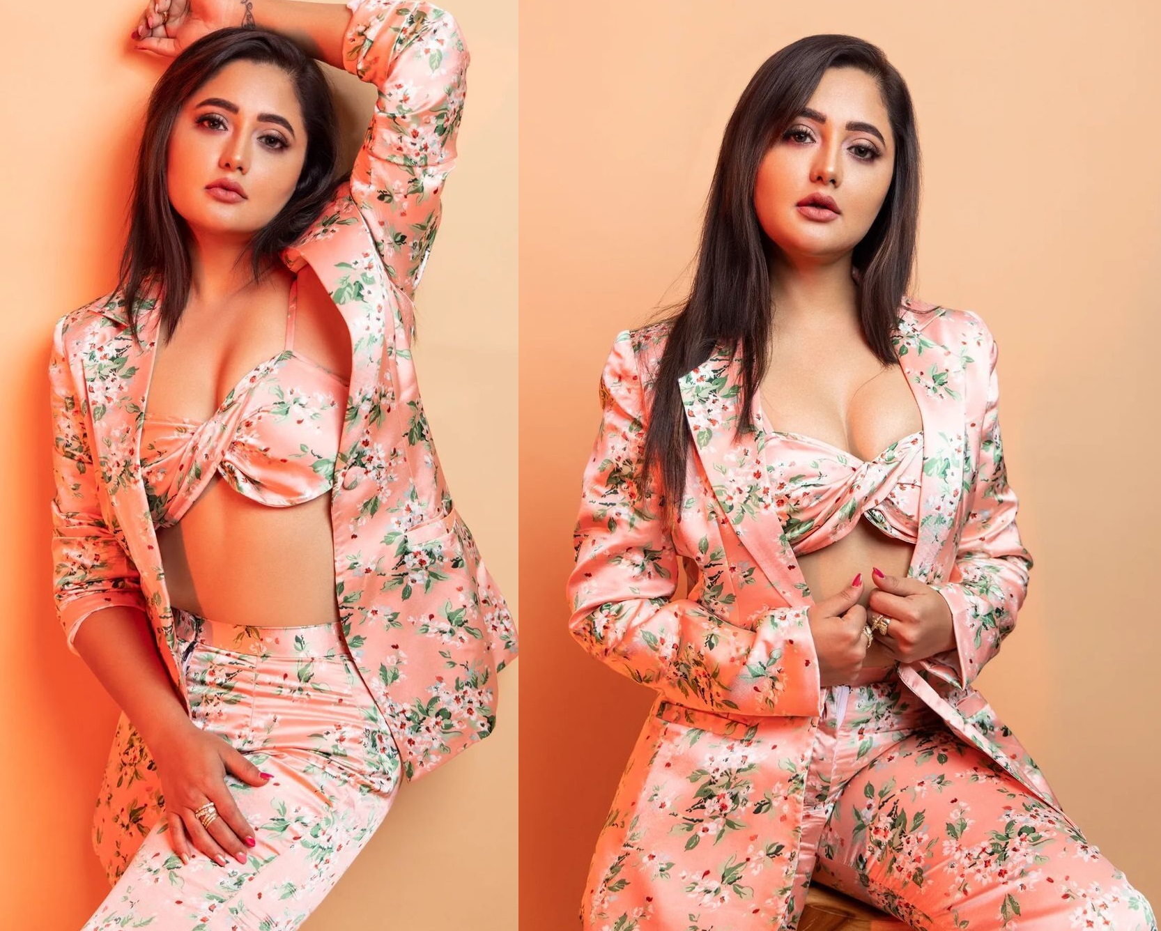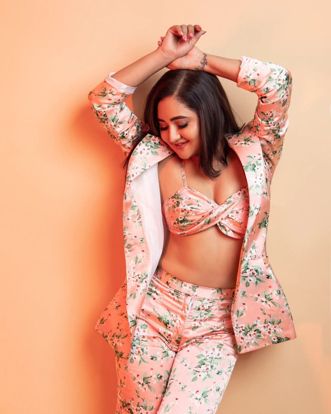 પરંતુ તે ઈન્સ્ટાગ્રામ દ્વારા તેના ફેન્સ સાથે જોડાયેલી રહે છે. હાલમાં જ અભિનેત્રીએ તેની સિઝલિંગ સ્ટાઇલ ચાહકોને બતાવી છે અને તેનો નવો લુક શેર કર્યો છે. લેટેસ્ટ ફોટોશૂટ માટે રશ્મિએ ફ્લોરલ પ્રિન્ટ સાથે પીચ ટ્રાઉઝર અને મેચિંગ બ્લેઝર પહેર્યુ છે અને આ સાથે તેણે સમાન શેડની બ્રાલેટ કેરી કરી છે.