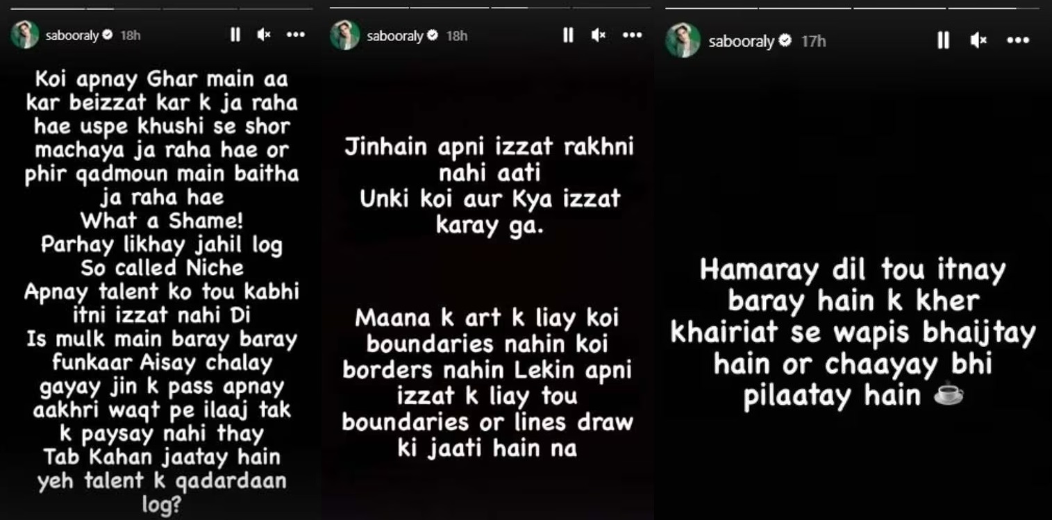 સબૂરે પોતાની સ્ટોરીમાં લખ્યુ- માન્યુ કે આર્ટ માટે કોઇ દાયરો નથી અને બોર્ડ નથી પણ પોતાની ઇજ્જત માટે તો દાયરો બનાવવામાં આવે છે ને. કોઇ આપણા ઘરમાં આવી બેઇજ્જત કરી જઇ રહ્યુ છે, તેના પર ખુશીથી શોર મચાવવામાં આવી રહ્યો છે અને પછી કદમોમાં બેસવામાં આવી રહ્યુ છે. કેટલી શરમની વાત છે. ભણેલા ગણેલા ઝાહિલ લોકો છે આ. પોતાના ટેલેન્ટને તો ક્યારેય ઇજ્જત નથી આપી આ મુલ્કમાં, મોટા મોટા ફનકાર થયા એમ જ જતા રહ્યા,