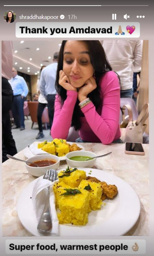 આ દરમિયાન અમદાવાદમાં શ્રદ્ધાએ ગુજરાતી ફૂડ ખમણનો સ્વાદ પણ માણ્યો હતો. તેણે ઇન્સ્ટા સ્ટોરી પર એક તસવીર શેર કરી હતી, જેમાં બે પ્લેટ ખમણની જોઇ શકાય છે. આ દરમિયાન શ્રદ્ધા ખમણની ડિશને જોતી અને મુસ્કુરાતી જોવા મળી હતી.અમદાવાદમાં કંઈક એવું થયું હતુ કે શ્રદ્ધા શરમથી લાલ થઈ ગઇ હતી.