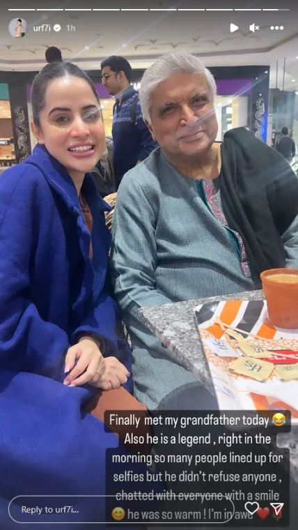 ઉર્ફીએ જાવેદ અખ્તર સાથે મુલાકાતની તસવીર શેર કરતા લખ્યુ કે, આખરે આજે મારી મારા દાદાજી સાથે મુલાકાત થઇ. તે એક લીજેન્ડ છે, સવારે સવારે એટલા લોકો સેલ્ફી લેવા માટે લાઇનમાં ઊભા હતા, પણ તેમણે કોઇને ના ન કહી, બધાની સાથે સ્માઇલથી વાતચીત કરી. તે ઘણા વોર્મ છે. જો કે, ઉર્ફીને કેટલાક લોકોએ ટ્રોલ પણ કરી હતી. એક યુઝરે કમેન્ટ કરી કે ઉર્ફીએ દાદાને મળવા માટે આટલા કપડા કેવી રીતે પહેરી લીધા. એકે લખ્યુ- તને તો કપડાથી એલર્જી હતી ને. એક બીજાએ લખ્યુ-હવે દાદા-પૌત્રી ધમાલ કરશે.