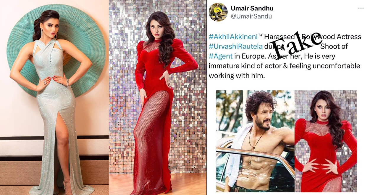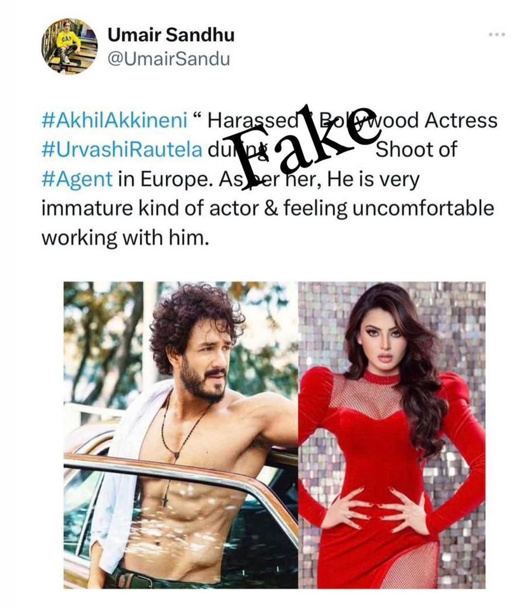 આ સાથે અભિનેત્રીએ ઉમૈરના ટ્વીટનો સ્ક્રીનશોટ પણ શેર કર્યો. જેમાં લખ્યું હતુ કે- અખિલ અક્કીનેની દ્વારા એજન્ટ ફિલ્મના શૂટિંગ દરમિયાન અભિનેત્રી ઉર્વશી રૌતેલાને હેરાન કરવામાં આવી હતી. ફિલ્મનું શૂટિંગ યુરોપમાં ચાલી રહ્યું હતું. અભિનેત્રીના મતે અખિલ ખૂબ જ અપરિપક્વ પ્રકારનો અભિનેતા છે, અને તેણે મને ખૂબ જ અનકંફર્ટેબલ કરી છે. ઉર્વશીએ ઉમૈરના આ ટ્વિટને ફેક ગણાવ્યું છે અને લીગલ નોટિસ મોકલી છે.