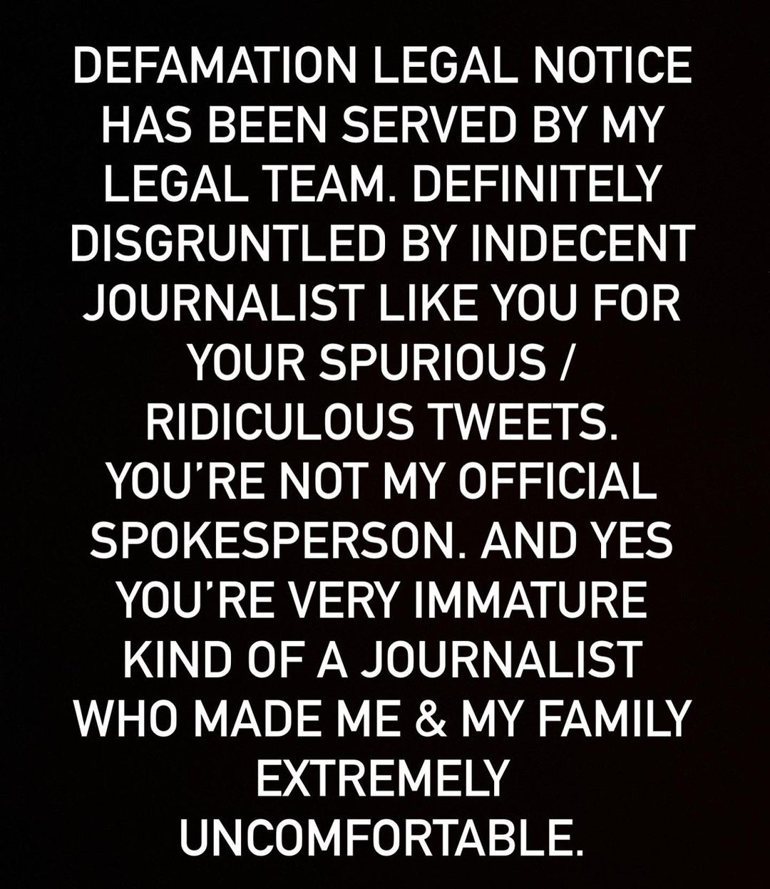 ઉર્વશી રૌતેલાએ હાલમાં જ તેના ઈન્સ્ટાગ્રામ પર એક પોસ્ટ શેર કરી છે, જેમાં તેણે જણાવ્યું છે કે તેની ટીમે ઉમૈર સંધુ નામની વ્યક્તિને લીગલ નોટિસ મોકલી છે. ઉર્વશીએ લખ્યું- મારી લીગલ ટીમ દ્વારા તેને માનહાનિની લીગલ નોટિસ મોકલવામાં આવી છે. હું તમારા જેવા અભદ્ર પત્રકારો, તમારી નકલી અને હાસ્યાસ્પદ ટ્વીટ્સથી નારાજ છું, તમે મારા સત્તાવાર પ્રવક્તા નથી અને હા તમે ખૂબ જ અપરિપક્વ પ્રકારના પત્રકાર છો જેણે મને અને મારા પરિવારને ખૂબ જ અનકંફર્ટેબલ દીધો.